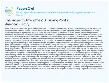 The Sixteenth Amendment: A Turning Point in American History. (2024, Mar 01). Retrieved from https://hub.papersowl.com/examples/the-sixteenth-amendment-a-turning-point-in-american-history/