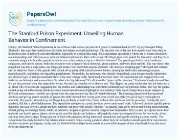 The Stanford Prison Experiment: Unveiling Human Behavior in Confinement. (2024, Jul 21). Retrieved from https://hub.papersowl.com/examples/the-stanford-prison-experiment-unveiling-human-behavior-in-confinement/