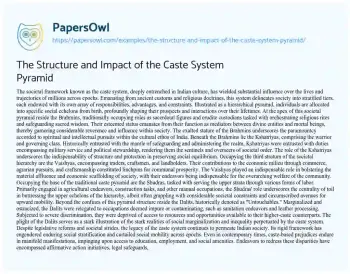 In summation, the caste system's pyramidical edifice embodies a multifaceted and enduring social construct that has left an indelible imprint on Indian society across millennia. From the apex occupied by the Brahmins to the Dalits relegated outside the hierarchy, each echelon of the pyramid reflects distinctive roles and obligations that have historically demarcated individuals' societal status and life trajectories. Despite strides made in ameliorating caste-based biases, the legacy of the caste system continues to reverberate in contemporary India. Addressing its ramifications necessitates a nuanced grasp of its genesis, perpetuation, and ongoing endeavors to foster social equity and justice.