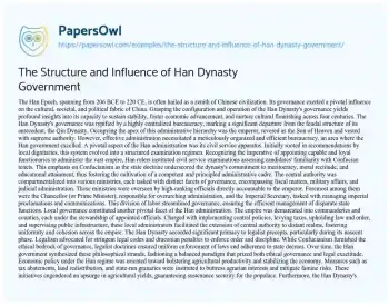 This essay is about the government structure of the Han Dynasty and its impact on Chinese civilization. It explains how the Han Dynasty maintained stability and promoted growth through a centralized bureaucracy, a merit-based civil service system, and the integration of Confucian and legalist principles. The essay highlights the roles of local administration, economic policies aimed at supporting agriculture and trade, and military strategies for defense and expansion. It also discusses the lasting legacy of the Han government on future Chinese dynasties and administrative practices. Overall, the essay underscores the sophistication and effectiveness of Han Dynasty governance.