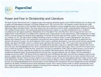 Power and Fear in Dictatorship and Literature. (2020, Mar 04). Retrieved from https://hub.papersowl.com/examples/the-symbolism-of-power-in-lord-of-the-flies/
