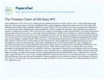 This essay about the enduring charm of Old Navy NYC, a beloved fixture in the bustling streets of New York City. It explores how this retail store, founded in 1994, transcends its commercial purpose to become a symbol of community, connection, and heritage. Despite undergoing renovations, Old Navy NYC retains its unique character and serves as a bridge between the past and present. More than just a place to shop, it hosts events and activities that bring people together, highlighting its significance as a hub of camaraderie in the heart of Manhattan. PapersOwl offers a variety of free essay examples on the topic of New York City.