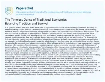 This essay delves into the intricate world of traditional economies, painting a vivid picture of economic systems deeply rooted in customs, community, and harmony with nature. It explores how these economies operate on principles of barter and trade, emphasizing sustainability and communal well-being over individual profit. The narrative contrasts the communal, sustainable practices of traditional economies with the profit-driven motives of modern capitalism, highlighting the former’s emphasis on environmental stewardship and social cohesion. The essay also acknowledges the challenges faced by traditional economies, including vulnerability to external factors and limited technological advancement. Ultimately, it posits that traditional economies offer valuable lessons in sustainability and community-oriented living, providing a complementary perspective that could help address contemporary global challenges such as climate change and social inequality, suggesting a balanced fusion of tradition and modernity for a sustainable future. On PapersOwl, there’s also a selection of free essay templates associated with Tradition.