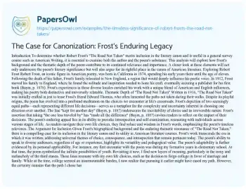 The Case for Canonization: Frost's Enduring Legacy. (2021, Mar 20). Retrieved from https://hub.papersowl.com/examples/the-timeless-significance-of-robert-frosts-the-road-not-taken/