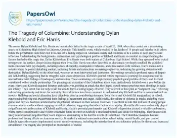 This essay about Dylan Klebold and Eric Harris examines the factors that led to the Columbine High School massacre on April 20, 1999. It explores their psychological profiles, with Harris displaying psychopathic traits and Klebold struggling with severe depression. The essay discusses their feelings of social alienation and the meticulous planning of their attack, highlighting how bullying and mental health issues contributed to their actions. It also addresses the broader impact of the Columbine tragedy on American society, including changes in school safety policies, mental health awareness, and the ongoing effort to prevent similar incidents. The essay underscores the importance of addressing bullying and mental health to prevent future tragedies.