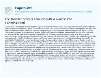 This essay delves into the complex and disturbing story of Lemuel Smith, a notorious figure in criminal history. It explores Smith’s transition from petty crimes to heinous acts of murder in the 1970s and 1980s, painting a chilling picture of his criminal evolution. A significant focus is placed on Smith’s diagnosis of dissociative identity disorder, examining how this mental health condition influenced the legal proceedings and discussions around criminal responsibility. The essay critically examines Smith’s interactions with the justice system, highlighting the challenges and limitations faced when dealing with criminals suffering from severe psychological issues. Through Smith’s story, the essay raises important questions about the intersection of mental health and criminal behavior, emphasizing the need for a better understanding and integration of mental health considerations in the legal framework. Ultimately, the piece serves as a reflection on the darker aspects of human behavior and the imperative to address mental health issues more effectively within society and the criminal justice system. Additionally, PapersOwl presents more free essays samples linked to Story.