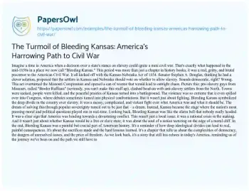 The Turmoil of Bleeding Kansas: America's Harrowing Path to Civil War. (2024, Jan 26). Retrieved from https://hub.papersowl.com/examples/the-turmoil-of-bleeding-kansas-americas-harrowing-path-to-civil-war/
