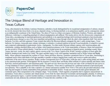 The Unique Blend of Heritage and Innovation in Texas Culture. (2024, Apr 22). Retrieved from https://hub.papersowl.com/examples/the-unique-blend-of-heritage-and-innovation-in-texas-culture/
