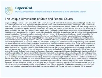 This essay highlights the main differences between state and federal courts in the United States. It compares state courts to local guides who handle a wide range of legal matters within state borders, reflecting regional values and laws. Federal courts are likened to grand highways dealing with issues that cross state lines, including constitutional challenges and federal crimes. The essay explains the structural differences, with state courts having varying systems while federal courts have a uniform structure nationwide. It also explores the types of cases each court handles and how they often intersect, reflecting the balance of power within the U.S. judicial system.