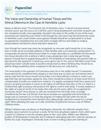 The Value and Ownership of Human Tissue and the Ethical Dilemma in the Case of Henrietta Lacks