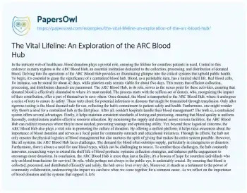 The Vital Lifeline: An Exploration of the ARC Blood Hub. (2023, Oct 26). Retrieved from https://hub.papersowl.com/examples/the-vital-lifeline-an-exploration-of-the-arc-blood-hub/