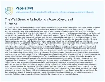 In conclusion, Wall Street is a complex and multifaceted institution that embodies the power, greed, and influence that define the world of finance. As a student of economics and finance, I am keenly aware of the challenges and opportunities that Wall Street presents to individuals and society at large.