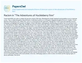 This essay will analyze the theme of American racism in Mark Twain’s “The Adventures of Huckleberry Finn.” It will discuss how the novel critiques racial attitudes of its time and its ongoing relevance in understanding American history and racial dynamics. At PapersOwl, you’ll also come across free essay samples that pertain to Huckleberry Finn.