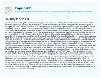 This essay will explore the theme of jealousy as depicted through the characters of Iago, Roderigo, and Othello in Shakespeare’s play “Othello.” It will discuss how jealousy acts as a driving force in the plot and examine the different ways it manifests in each character, ultimately leading to the tragedy of the play. PapersOwl offers a variety of free essay examples on the topic of Iago.