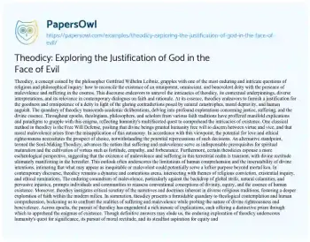 This essay about theodicy explores the philosophical and theological attempt to justify God’s goodness despite the presence of evil and suffering in the world. It outlines the origins of the term by Gottfried Wilhelm Leibniz and examines different approaches to resolving this dilemma, including the Free Will Defense and the Soul-Making Theodicy. The essay also discusses the eschatological perspective, which sees divine justice as ultimately prevailing in the afterlife. Theodicy is presented as an ongoing challenge that intersects with religious belief, existential questions, and ethical considerations, especially in light of contemporary global issues. By engaging with various interpretations and models, the essay highlights the human quest for understanding and meaning in the face of life’s complexities and contradictions.