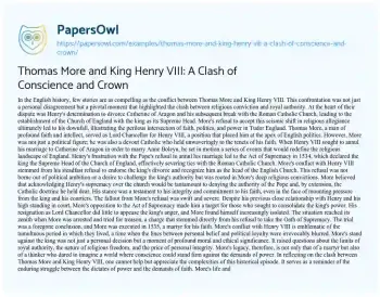 This essay about the conflict between Thomas More and King Henry VIII centers on the profound clash over religious conviction and royal authority. It examines the roots and repercussions of their disagreement, initiated by Henry’s divorce from Catherine of Aragon and the establishment of the Church of England. More’s refusal to recognize Henry as the Supreme Head of the Church, grounded in his deep Catholic faith, led to his eventual downfall and execution. The narrative highlights More’s integrity and the personal cost of his opposition to the king’s demands. This story not only reflects the political and religious turmoil of Tudor England but also raises timeless questions about the limits of power, the nature of religious freedom, and the significance of personal conscience. More’s legacy is portrayed as a beacon of moral fortitude in the face of political pressures, underscoring the value of standing by one’s principles.