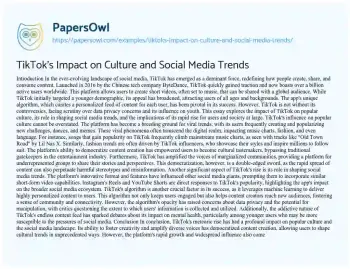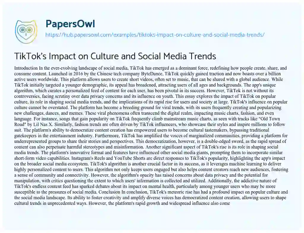 TikTok's Impact on Culture and Social Media Trends. (2025, Mar 27). Retrieved from https://hub.papersowl.com/examples/tiktoks-impact-on-culture-and-social-media-trends/