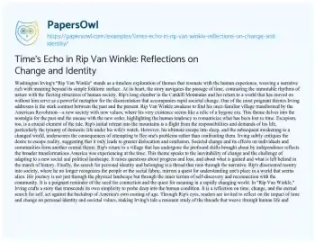 This essay about “Rip Van Winkle” unpacks the timeless narrative’s exploration of profound themes such as the relentless passage of time and the stark contrasts between past and present. It delves into how Washington Irving uses Rip’s extended slumber to comment on the consequences of escapism and the inevitable changes society undergoes over time. Additionally, the narrative serves as a platform to discuss the quest for personal identity and belonging in a world that feels alien. The essay illuminates how Rip’s awakening in a post-Revolutionary America symbolizes the disorientation that comes with rapid societal change, highlighting the tension between tradition and progress. Through the lens of Rip’s experiences, the essay explores the human desire to find one’s place in the world amidst the flux of time and society’s evolution. Also at PapersOwl you can find more free essay examples related to Rip Van Winkle.