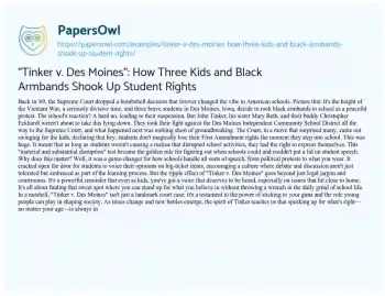 "Tinker v. Des Moines": How Three Kids and Black Armbands Shook Up Student Rights. (2024, Mar 18). Retrieved from https://hub.papersowl.com/examples/tinker-v-des-moines-how-three-kids-and-black-armbands-shook-up-student-rights/