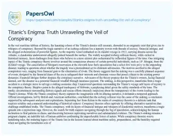 Titanic's Enigma: Truth Unraveling the Veil of Conspiracy. (2024, Feb 01). Retrieved from https://hub.papersowl.com/examples/titanics-enigma-truth-unraveling-the-veil-of-conspiracy/