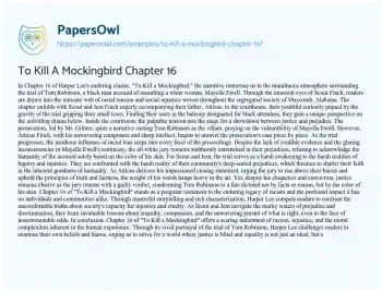 This essay about Chapter 16 of “To Kill a Mockingbird” examines the trial of Tom Robinson, highlighting the pervasive racial prejudice in Maycomb, Alabama. Through Scout and Jem’s eyes, readers witness the stark injustices and biases within the courtroom. Harper Lee’s poignant narrative exposes the harsh realities of bigotry and the struggle for justice, prompting reflection on societal inequalities and the importance of empathy and fairness.