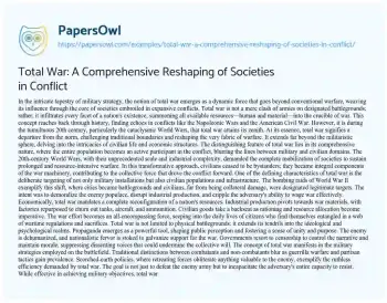 This essay about total war into the intricate dynamics of military strategy, tracing its evolution beyond conventional warfare. Total war transcends traditional boundaries, infiltrating every aspect of a nation’s existence, mobilizing both human and material resources into the crucible of conflict. Examining historical echoes in conflicts like the Napoleonic Wars and the American Civil War, the narrative reaches its zenith during the 20th-century World Wars. The essay highlights total war’s departure from normative boundaries, reshaping societal fabric and involving the entire population in the conflict. It explores the deliberate targeting of civilian populations and infrastructure, the economic reconfiguration demanded, and the ideological and psychological impact on societies. The text emphasizes the enduring scars, both physical and psychological, that total war leaves on nations, necessitating comprehensive reconstruction beyond mere economic and infrastructural aspects. In conclusion, total war represents a transformative paradigm shift in armed conflict, blurring distinctions between military and civilian spheres and leaving a profound mark on human history. Additionally, PapersOwl presents more free essays samples linked to War.