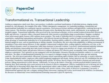 This essay about transactional versus transformational leadership explores the distinctions, benefits, and limitations of these two management styles. Transactional leadership is described as a structured approach where clear rewards and consequences are linked to performance, suitable for environments requiring consistency and routine. In contrast, transformational leadership is more dynamic, focusing on inspiring and motivating employees beyond simple transactions to achieve greater organizational goals. This style is ideal for sectors that demand creativity and adaptability. The essay emphasizes that the effectiveness of each leadership style depends on the organizational context and the specific needs of the situation, suggesting that successful leaders should be flexible in their approaches.