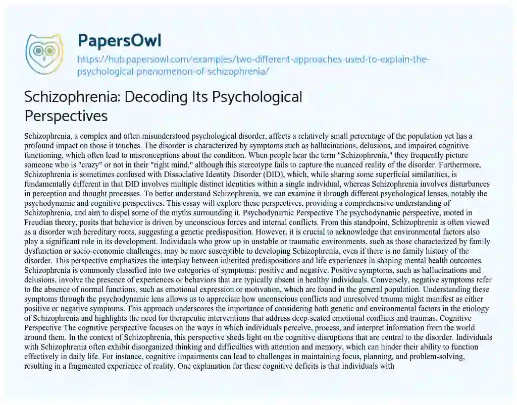 Schizophrenia: Decoding Its Psychological Perspectives. (2019, Apr 06). Retrieved from https://hub.papersowl.com/examples/two-different-approaches-used-to-explain-the-psychological-phenomenon-of-schizophrenia/