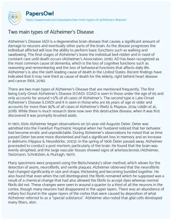 Two main types of Alzheimer's Disease. (2019, Dec 31). Retrieved from https://hub.papersowl.com/examples/two-main-types-of-alzheimers-disease/