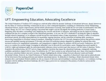 An essay exploring the United Federation of Teachers (UFT) could delve into its multifaceted role as a prominent educational advocacy organization. It might focus on the UFT’s origins, tracing its evolution from a bargaining force to a powerful advocate for educational equity, teacher empowerment, and comprehensive improvements in the educational landscape. The essay could highlight the UFT’s initiatives, such as collective bargaining for educators’ rights, fostering continuous professional development, and advocating for policies supporting student success and equitable learning environments. Furthermore, it could discuss the union’s involvement in societal issues, political engagements, and the challenges it faces in balancing advocacy with broader educational reforms. Overall, the essay would encapsulate the UFT’s pivotal role in shaping educational policies, championing social justice causes, and serving as a beacon for the enhancement of both the teaching profession and students’ educational experiences. Moreover, at PapersOwl, there are additional free essay samples connected to Education.