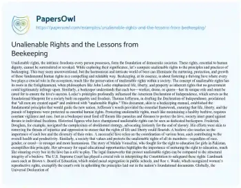 This essay about unalienable rights draws an analogy with the principles of beekeeping to explore the significance of these fundamental freedoms. Unalienable rights, inherent to every person, cannot be surrendered or revoked. The essay compares the protection and nurturing of these rights to the careful maintenance of a beehive, where each bee plays a crucial role in the ecosystem. Historical figures like Frederick Douglass and Malala Yousafzai are likened to dedicated beekeepers who protect and advocate for these rights. It also discusses the role of legal frameworks, like the U.S. Supreme Court and the Universal Declaration of Human Rights, in safeguarding unalienable rights. The essay emphasizes the importance of community and collaboration in promoting and protecting these essential freedoms.