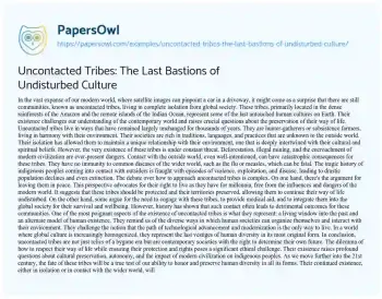 This essay delves into the intriguing world of uncontacted tribes, isolated communities that live untouched by modern civilization. It highlights their existence in remote areas like the Amazon rainforests and Indian Ocean islands, emphasizing their traditional ways of life, which have remained unchanged for millennia. The essay discusses the threats these tribes face, including deforestation, illegal mining, and the risks associated with contact with the outside world, such as disease and exploitation. It explores the complex debate surrounding the approach to uncontacted tribes, weighing the argument for non-interference against the potential benefits and risks of contact. The essay reflects on the significance of these tribes as symbols of human diversity and alternate ways of living, challenging the notion that modernization is the only path. It concludes by considering the ethical implications of their existence and the global responsibility to respect and protect these unique cultures. The piece serves as a thoughtful examination of the delicate balance between preserving these tribes’ autonomy and ensuring their protection in a rapidly changing world. Also at PapersOwl you can find more free essay examples related to Culture.