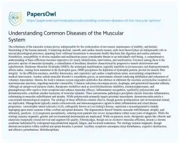 This essay is about various diseases that affect the muscular system, impacting movement, stability, and overall bodily functions. It discusses muscular dystrophy, highlighting Duchenne Muscular Dystrophy as a genetic disorder causing progressive muscle weakness. Myasthenia gravis, an autoimmune disease leading to muscle fatigue, is also explored, along with inflammatory myopathies like polymyositis and dermatomyositis, which cause chronic muscle inflammation. Amyotrophic lateral sclerosis (ALS), a neurodegenerative disorder resulting in muscle atrophy and paralysis, is examined, as well as fibromyalgia, a chronic condition characterized by widespread pain and fatigue. The essay emphasizes the importance of early diagnosis and intervention, while noting ongoing research efforts to improve treatments and outcomes for these conditions.