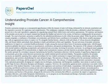 This essay about prostate cancer provides a comprehensive overview of the disease, including its definition, causes, risk factors, and prevalence, as well as the anatomy and function of the prostate gland. It explains how prostate cancer develops due to a combination of genetic, environmental, and lifestyle factors, with a higher risk in men over 50, those with a family history, and certain racial groups. The essay also discusses the global prevalence of the condition, emphasizing the importance of screening for early detection and the nuanced approach needed to balance the benefits against the risks of over-diagnosis. Treatment options, ranging from active surveillance to more aggressive interventions, are explored, highlighting the role of ongoing research in improving outcomes. The piece concludes by stressing the significance of public awareness, early detection, and informed treatment choices in the fight against prostate cancer, underscoring the collective effort needed to address this major health concern. PapersOwl showcases more free essays that are examples of Prostate Cancer.