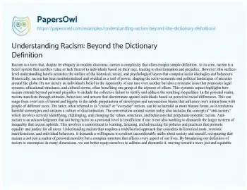 Understanding Racism: Beyond the Dictionary Definition. (2024, Feb 27). Retrieved from https://hub.papersowl.com/examples/understanding-racism-beyond-the-dictionary-definition/