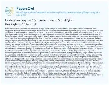 In conclusion, the 26th Amendment stands as a testament to the resilience of American democracy, affirming that the right to vote is an inherent right of all citizens, not a privilege for the few. By enfranchising 18-year-olds, the Amendment broke down barriers and expanded the democratic framework. Yet, the work is far from complete. As we consider the legacy of the 26th Amendment, we must recommit to the ongoing pursuit of a democracy where every voice is heard, every vote is counted, and every citizen, regardless of age, is empowered to shape the nation's destiny.