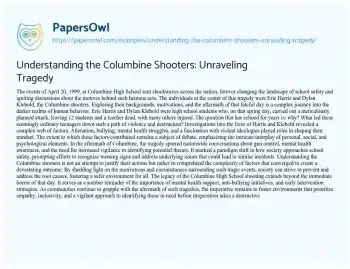 Delve into the haunting events of April 20, 1999, with “Understanding the Columbine Shooters: Unraveling Tragedy.” This essay explores the complex motives behind the devastating attack at Columbine High School, shedding light on the lives of Eric Harris and Dylan Klebold. Investigating the intertwining factors of alienation, bullying, and mental health struggles, the essay navigates the intricate web that led to their violent actions. Beyond dissecting the tragedy, it emphasizes the profound impact on nationwide conversations about school safety, gun control, and mental health awareness. By grappling with the darker aspects of human behavior, the essay aims to contribute to a collective understanding of the factors at play and the imperative for societal change in fostering safer environments. At PapersOwl, you’ll also come across free essay samples that pertain to Tragedy.