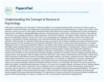 This essay is about the concept of nurture in psychology, focusing on how environmental factors and experiences shape human development and behavior. It discusses how nurturing begins from prenatal conditions and continues through family care, education, social interactions, and cultural influences. The essay highlights the importance of early life experiences, social environments, and cultural norms in shaping cognitive and emotional development. It also explores how personal experiences, both positive and negative, impact psychological growth. The interplay between genetic predispositions and environmental influences is examined, emphasizing the significance of nurturing environments in realizing individual potential and addressing psychological challenges.