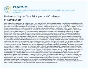 Order now The idea of collective ownership is essential to communism. In contrast to capitalism, which advocates for individual use being the owner of the output entails to generate riches for a select few, communism implies that the society as a whole should own all means of production, including factories, land, and resources. The goal of collective ownership is to eliminate the inequality and exploitation brought about by capitalism systems so that wealth is allocated according to necessity rather than selfish interests. The intention is to establish a society in which every individual has access to the means required for a respectable existence.