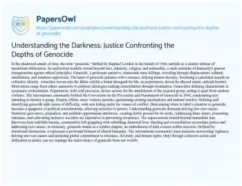 This essay about the concept of genocide, coined by Raphael Lemkin in 1944, explores the dark contours of intentional obliteration that transcend race, ethnicity, and nationality. Beyond mass killings, genocide encompasses displacement, cultural annihilation, and insidious oppression, constituting a calculated assault on collective identity. The heart of this menace lies in its systematic orchestration, distinguishing it from random violence. Despite international efforts, the challenge of defining and identifying genocide persists, often entangled in political considerations. Root causes, including historical grievances and political opportunism, create fertile ground for its occurrence. The essay emphasizes the imperative of addressing these issues, promoting tolerance, and cultivating inclusive societies to prevent recurrence. It underscores the profound betrayal of shared humanity and calls for unwavering vigilance, justice, and global commitment to expunge the malevolence of genocide from our world’s fabric. Moreover, at PapersOwl, there are additional free essay samples connected to Justice.