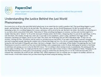This essay about the Just World Phenomenon explores our innate desire to believe in a fair and just world. It delves into how this belief influences our perceptions of justice, responses to suffering, and societal structures. The essay highlights the complexities of this psychological mechanism, including its role in victim-blaming and perpetuating inequalities. It argues for recognizing and challenging the biases inherent in the Just World Phenomenon to foster empathy and create a more equitable society. Additionally, PapersOwl presents more free essays samples linked to Justice.