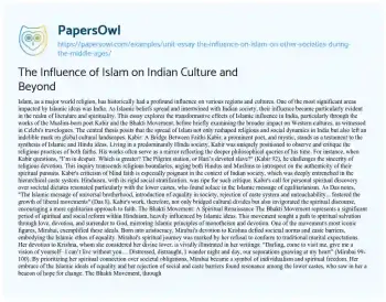Islam, as a major world religion, has historically had a profound influence on various regions and cultures. One of the most significant areas impacted by Islamic ideas was India. As Islamic beliefs spread and intertwined with Indian society, their influence became particularly evident in the realm of literature and spirituality. This essay explores the transformative effects of Islamic influence in India, particularly through the works of the Muslim-born poet Kabir and the Bhakti Movement, before briefly examining the broader impact on Western cultures, as witnessed in Celebi's travelogues.