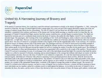 This essay delves into the poignant narrative of United Flight 93, a saga set against the backdrop of the tragic events of September 11, 2001. It portrays the flight not just as a chapter of national tragedy, but as a profound testament to the courage and resilience of ordinary individuals faced with extraordinary circumstances. The essay highlights the collective decision of the passengers to confront their hijackers, showcasing their act as one of unparalleled bravery and selfless heroism. It reflects on the complexity and emotional weight of the United 93 story, acknowledging it as a narrative that intertwines personal loss with collective grief and individual courage with national mourning. The piece underscores the importance of this narrative in the collective memory, honoring it as a symbol of the indomitable human spirit and a reminder of the depth of courage that lies within the hearts of ordinary people when united by a common resolve. Additionally, PapersOwl presents more free essays samples linked to Tragedy.