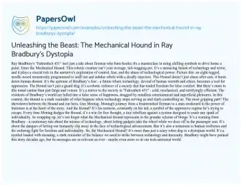 This essay delves into the menacing and symbolic presence of the Mechanical Hound in Ray Bradbury’s “Fahrenheit 451.” Far from being just a robotic creature, the Hound is a chilling embodiment of technological control and dehumanization in Bradbury’s dystopian vision. The essay paints a vivid picture of this eight-legged robotic dog as an enforcer of conformity, designed to hunt down human dissent with lethal precision. It explores how the Hound is not only a physical threat but also a reflection of the cold, mechanical nature of the society it serves. The piece highlights the Hound’s role in Guy Montag’s journey from a compliant fireman to a rebel, embodying the oppressive forces that Montag seeks to escape. The essay concludes by emphasizing the Mechanical Hound’s significance as a cautionary symbol, warning of the dangers of allowing technology to overpower our humanity. It underscores Bradbury’s timeless message about maintaining a balance between technological advancements and human values, a theme that resonates strongly in our increasingly tech-driven world. Also at PapersOwl you can find more free essay examples related to Ray Bradbury.
