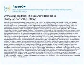 Unmasking Tradition: The Disturbing Realities in Shirley Jackson's 'The Lottery'. (2024, Feb 01). Retrieved from https://hub.papersowl.com/examples/unmasking-tradition-the-disturbing-realities-in-shirley-jacksons-the-lottery/
