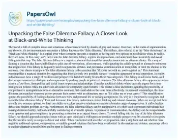 Unpacking the False Dilemma Fallacy: A Closer Look at Black-and-White Thinking. (2023, Dec 04). Retrieved from https://hub.papersowl.com/examples/unpacking-the-false-dilemma-fallacy-a-closer-look-at-black-and-white-thinking/