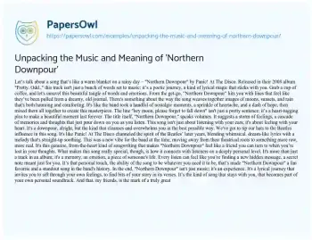 This essay offers an immersive exploration into Panic! At The Disco’s song “Northern Downpour,” delving into its lyrical depth and emotional resonance. The piece opens by highlighting the song’s poetic nature, emphasizing its ability to evoke a sense of nostalgia and introspection through vivid imagery and heartfelt phrases. It discusses the song’s title, “Northern Downpour,” as a metaphor for an emotional storm, reflecting the cascade of memories and feelings that the lyrics inspire. The essay also notes the Beatles’ influence in the song’s composition, recognizing a shift in the band’s musical style towards a more introspective and authentic sound. Importantly, the piece touches on the personal connection that fans have with the song, seeing it as more than just a track but a part of their own life experiences. Overall, the essay portrays “Northern Downpour” as a lyrical journey that invites listeners to navigate their own emotions and memories, solidifying its place as a timeless piece in modern music. PapersOwl offers a variety of free essay examples on the topic of Music.