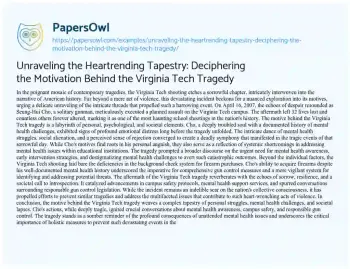 Unraveling the Heartrending Tapestry: Deciphering the Motivation Behind the Virginia Tech Tragedy. (2024, Mar 01). Retrieved from https://hub.papersowl.com/examples/unraveling-the-heartrending-tapestry-deciphering-the-motivation-behind-the-virginia-tech-tragedy/