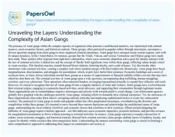 An essay on Asian gangs would delve into the multifaceted nature of these groups, exploring their cultural, socio-economic, and historical dimensions. It would discuss the diverse spectrum of Asian gangs, from street-level organizations to more organized criminal enterprises, examining their origins, values, and operations. The essay would also shed light on the challenges faced by marginalized communities, driving some individuals towards these groups as a means of empowerment or financial stability. Additionally, it would address the portrayal of Asian gangs in media and popular culture, aiming to dispel stereotypes and highlight the complexities within these organizations. Ultimately, the essay seeks to provide a comprehensive understanding of Asian gangs, acknowledging their diverse facets and societal implications. More free essay examples are accessible at PapersOwl about Understanding.
