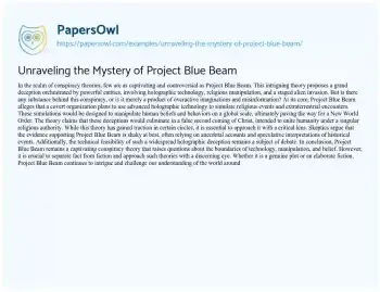 Explore the fascinating world of conspiracy theories with our essay, “Unraveling the Enigma of Project Blue Beam.” Delve into the controversial theory that alleges a grand deception involving holographic technology, religious manipulation, and a staged alien invasion. We dissect the core elements of Project Blue Beam and examine the evidence, all while encouraging a critical and discerning perspective. Join us on a journey that questions the boundaries of technology, manipulation, and belief, and discover whether this captivating conspiracy is grounded in reality or remains an elaborate fiction. At PapersOwl, you’ll also come across free essay samples that pertain to Mystery.